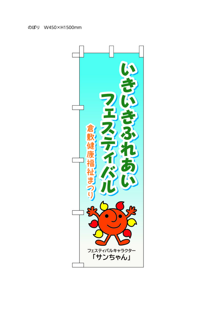 イベント用のぼり旗 コメントする / のぼり, 製作事例 / By nakayama-nobori いきいきふれあいフェスティバル実行様ののぼり旗を製作させていただきました。 キャラクターをプリントした素敵なのぼり旗が出来上がりました。 サイズ:W450xH1500 生地:ポンジ 仕様:フルカラー・周囲ヒートカット・チチ(3x5)